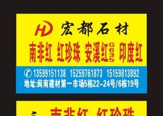 主營花崗巖石材:南非紅、紅珍珠、印度紅、安溪紅、喬治亞灰。地址:閩南建材市場5棟22.24號(hào) 6棟19號(hào)宏都石材。電話:15159813892
